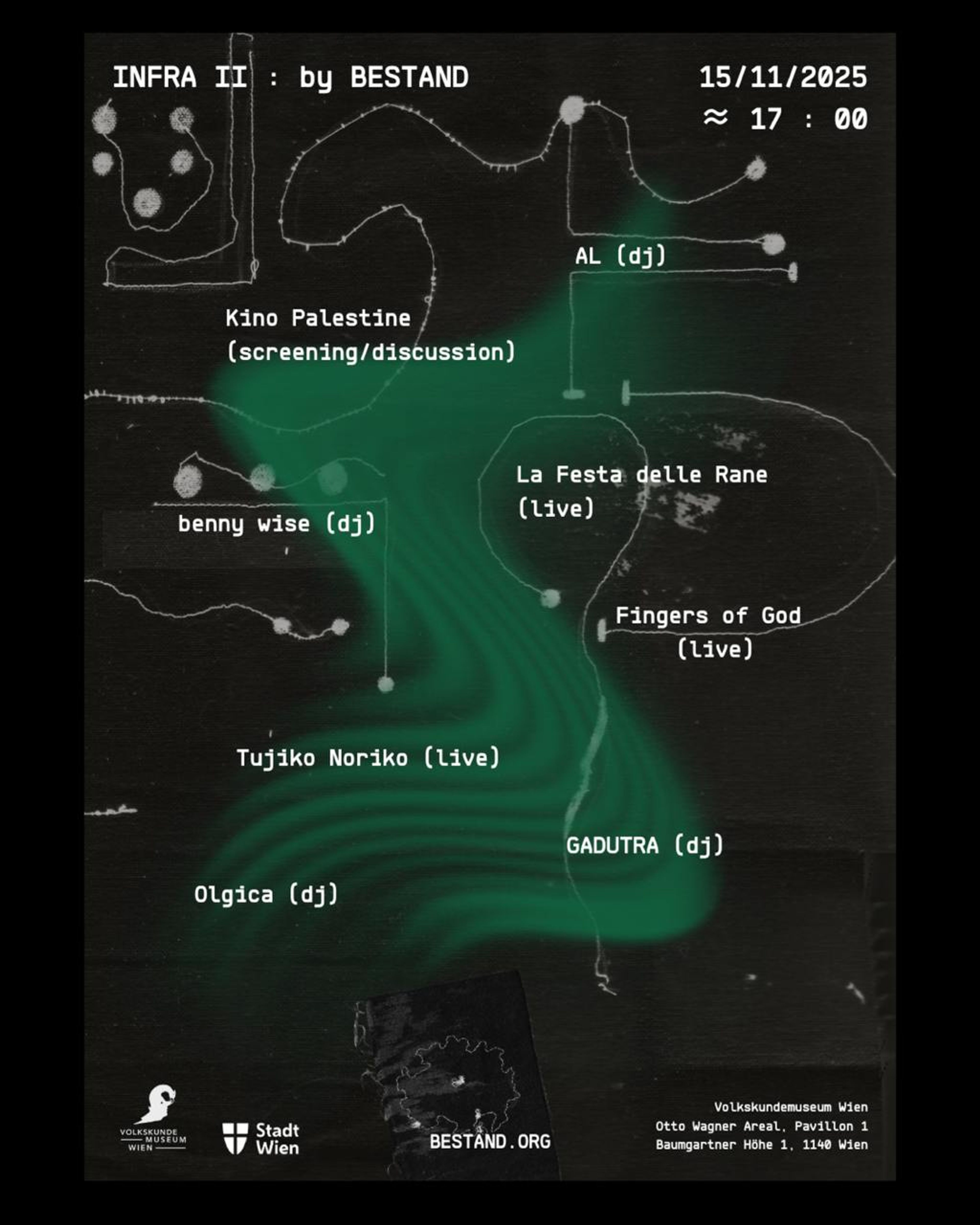 We are thankful for all the participating artists and the entire infra: team for once again making a collective effort! Thank you Volkskundemuseum for your cooperation and the City of Vienna for supporting us with funding.