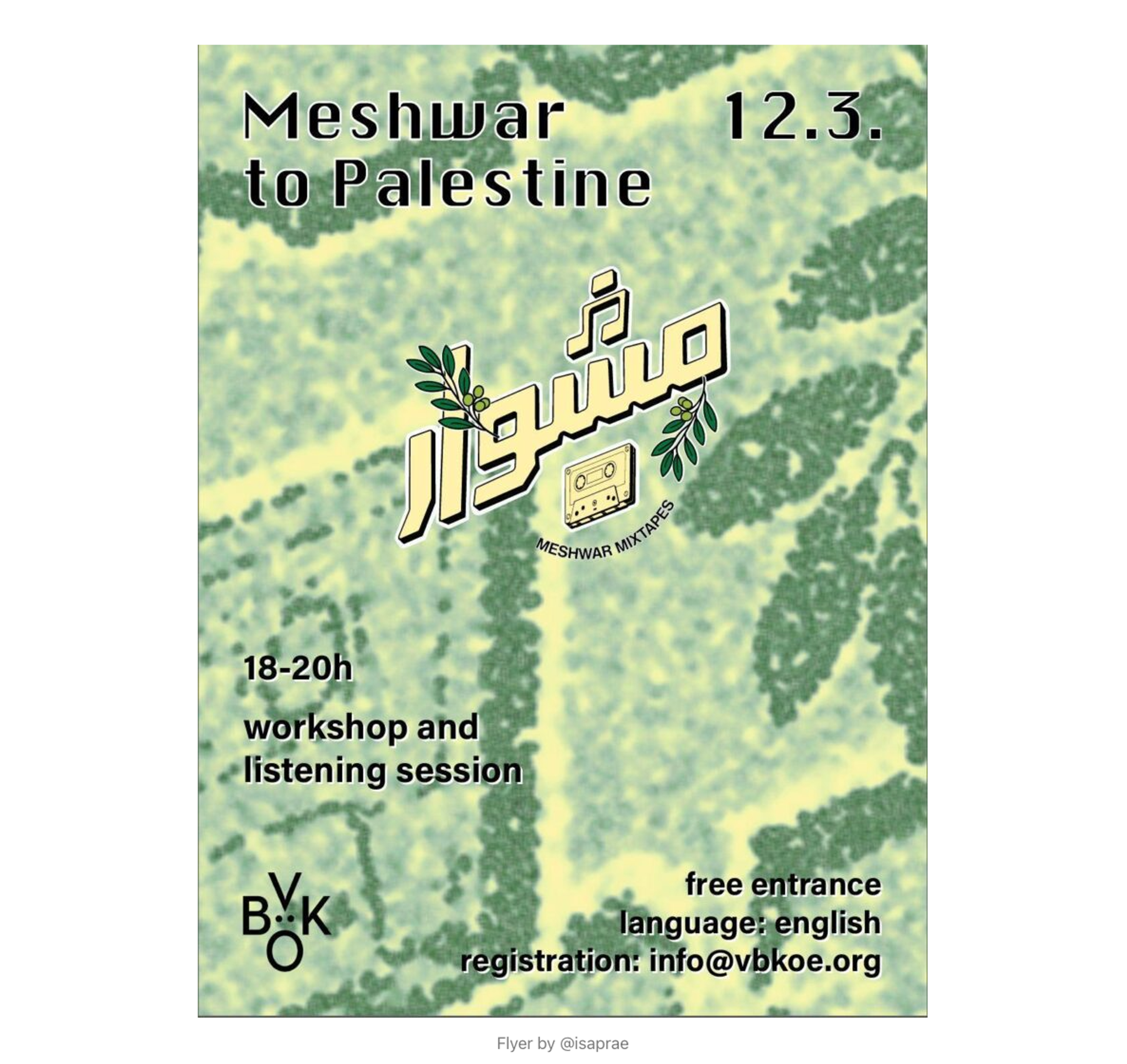 This workshop will delve into the origins and vision behind Meshwar Mixtapes, exploring how it functions as a platform for collective listening and cultural agency. Through a guided listening session, discussion on the curation process, and an open dialogue on the relationship between sound, identity, and activism, participants will be invited to reflect on how music shapes memory and belonging, particularly within diasporic and displaced communities.